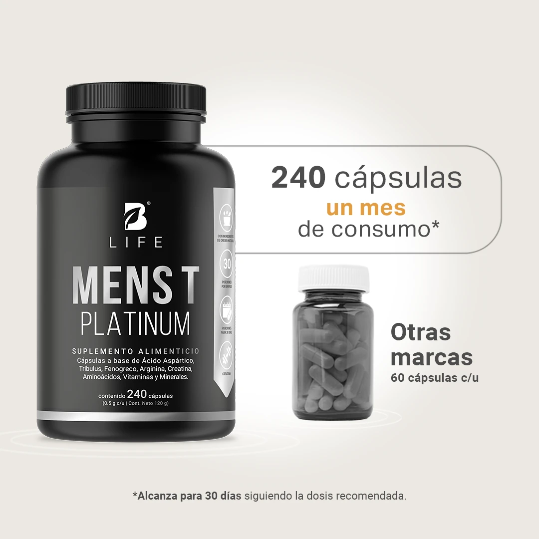 ¡Mens T Platinum B Life®, la opción preferida de los hombres! Cada cápsula de 500 mg contiene nuestra exclusiva fórmula elaborada a base de ácido aspártico, tribulus, fenogreco y arginina, activos esenciales para tu energía diaria.