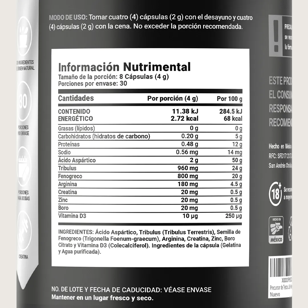¡Disfruta la formulación potenciada de Mens T Platinum B Life! La elección preferida de los hombres. Cada cápsula de 500 mg está diseñada para aportar Ácido Aspártico, Tribulus, Fenogreco y Arginina, enriquecida con Creatina, Aminoácidos, Vitaminas y Minerales, componentes de los que otras fórmulas carecen Contiene 240 cápsulas.