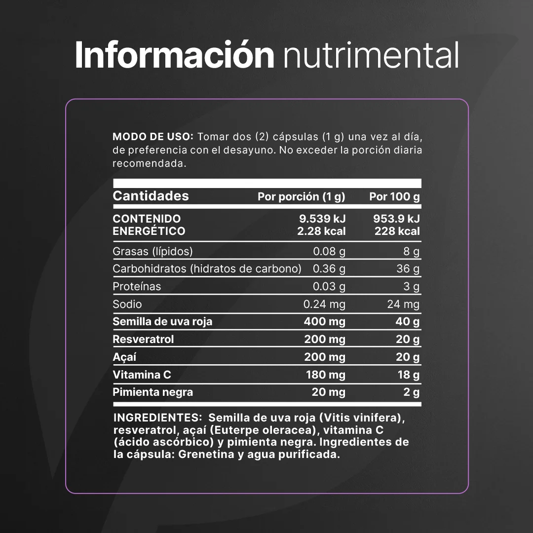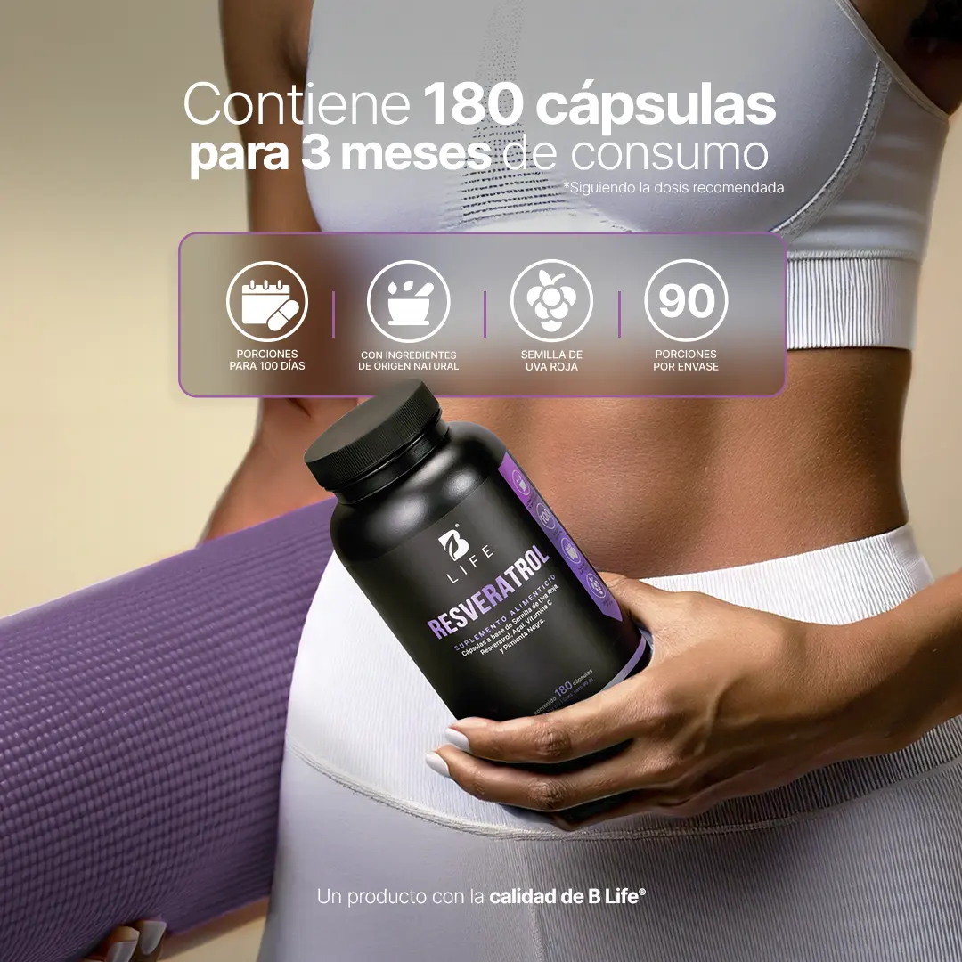 ¡Resveratrol B Life, un poderoso antioxidante! Cada cápsula de 500 mg contiene una formulación especial a base de resveratrol, semillas de uva roja, açaí y vitamina C. Esta exclusiva fórmula está enriquecida con pimienta negra, lo que potencia la absorción de los nutrientes.