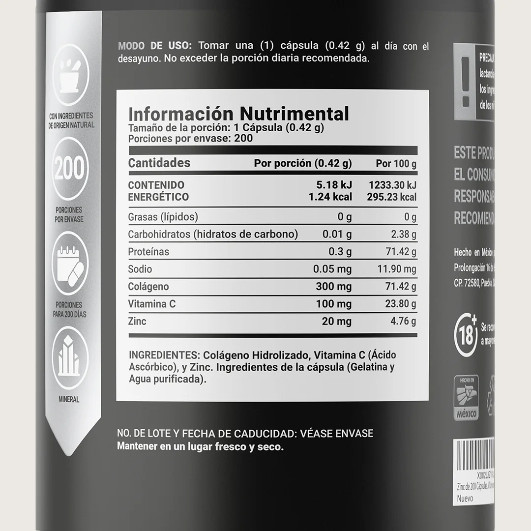¡Z Blend B Life, protección y bienestar en cada porción! Cada cápsula de 420 mg ofrece una composición especial que combina Zinc, Vitamina C y Colágeno, una formulación única que integra minerales, vitaminas y proteínas esenciales para tu vitalidad. Esta poderosa combinación no la encontrarás en otras presentaciones.